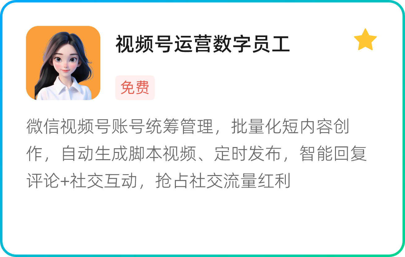 微信视频号账号统筹管理,批量化短内容创作,自动生成脚本视频、定时发布,智能回复评论+社交互动,抢占社交流量红利
