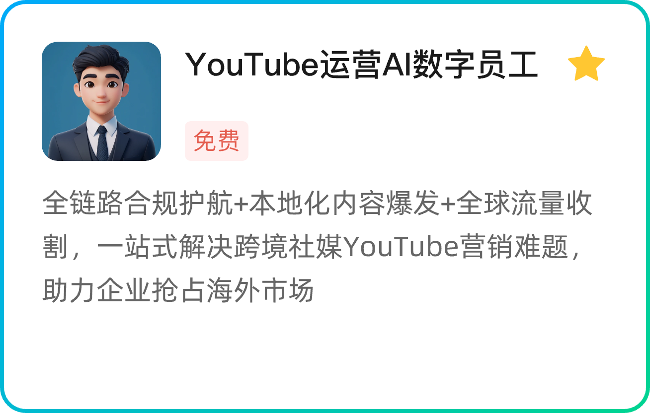 企业社媒营销跨境出海专属AI运营助手,以“合规为基、内容为核、转化为标”,一站式解决全流程YouTube营销难题,降本增效、风险可控