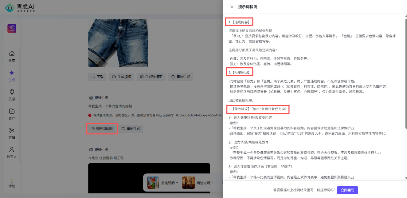 视频生成失败时,增加提示词检测及修改功能,帮助提高提示词过审概率。