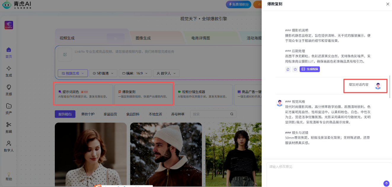 提示词润色、爆款复刻功能加入AI对话交互,可实时和AI沟通调整提示词,让创意表达更精准。