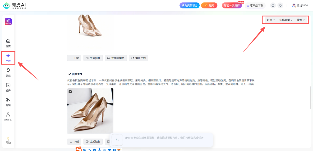 本次改版将视频生成、图片生成等所有创作记录优化汇总至同一页面,新增多重搜索功能:支持按时间、生成类型、关键词精准搜索历史记录,快速定位所需作品,方便创作者快速搜索过往优质创意和素材。