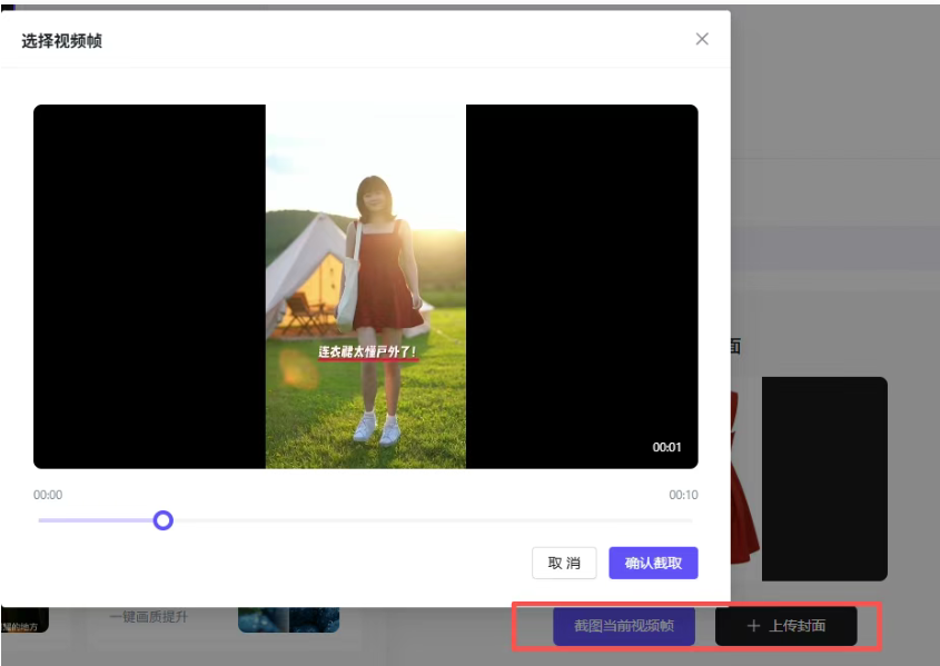 支持截取当前视频帧画面为封面或自行上传图片作为封面