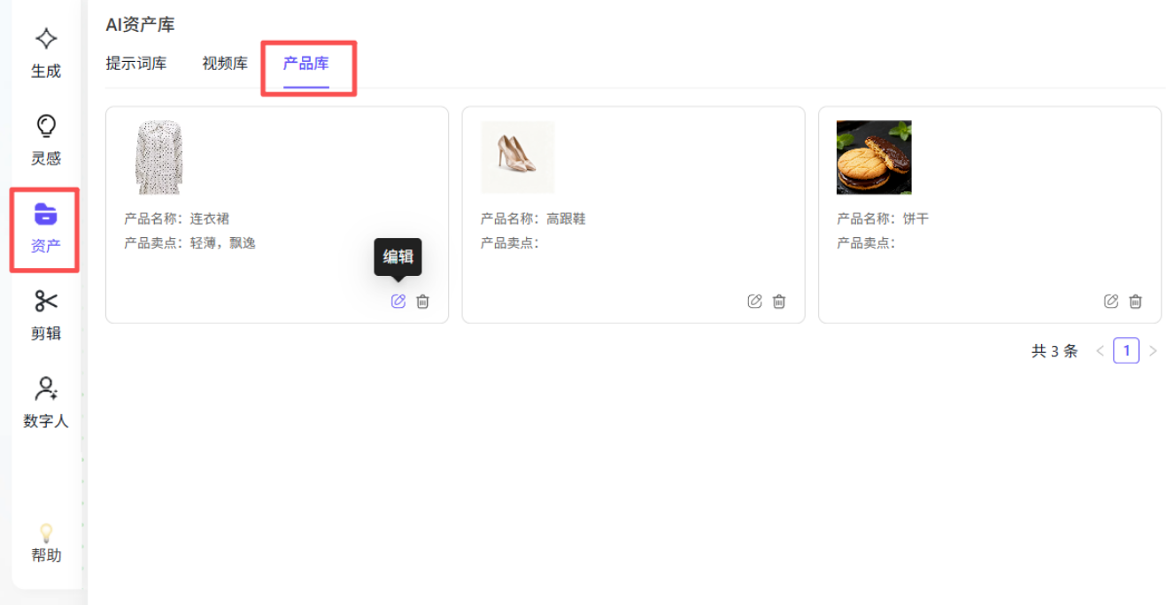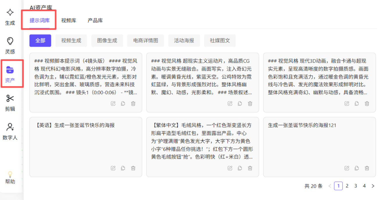新增AI资产库功能,建立个人专属素材资源库,实现提示词、视频、产品图的集中管理和重复复用,减少素材丢失风险,避免重复上传和构思,让素材利用更充分,创作流程更顺畅。