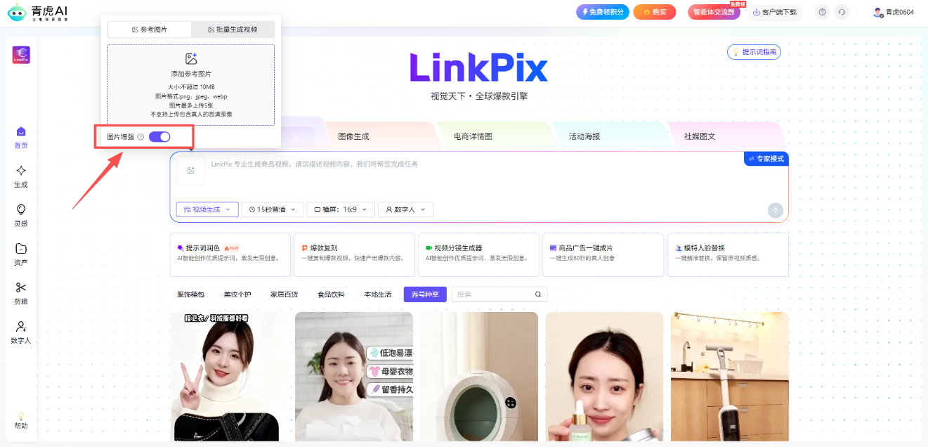 新增图片增强功能,可自行开启或关闭,上传产品图后AI自动识别同款相似产品,可提升AI对产品的理解度,有效降低产品变形率,生成效果更贴合产品。