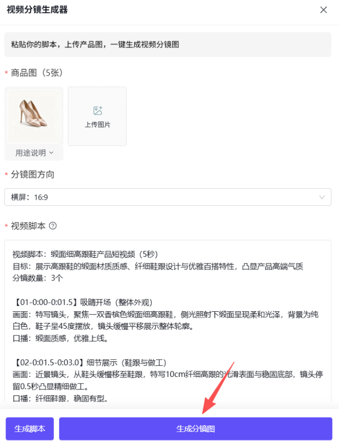 上传产品图后,AI自动生成视频分镜图,再根据分镜图生成完整视频,让AI视频画面更可控、更精准,完美贴合创作预期。