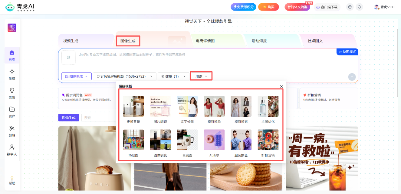包含AI消除、模特换脸、折扣营销等电商常见实用模板,一键套用即可快速生成优质主图。