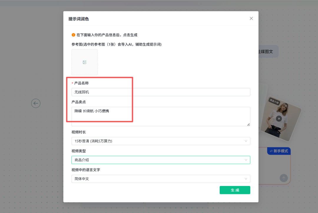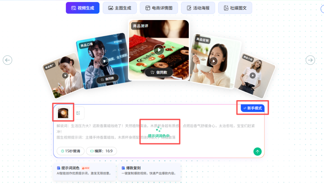 如果手里没有现成图片,或者想重点突出产品卖点,直接输入卖点就能让AI生成提示词,这对电商带货场景尤其实用。