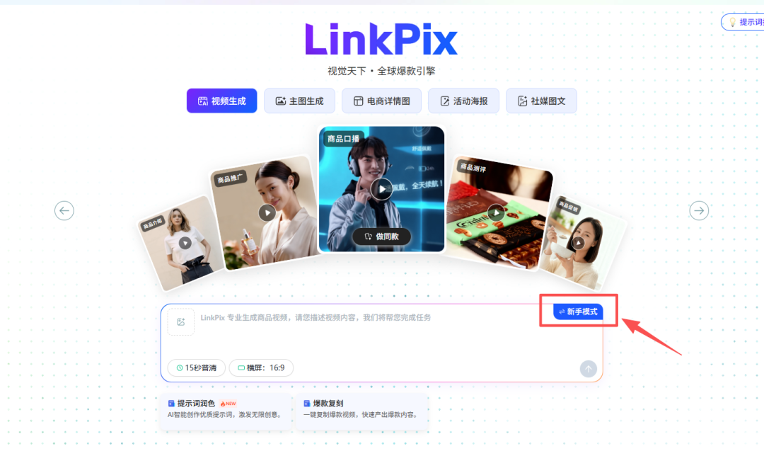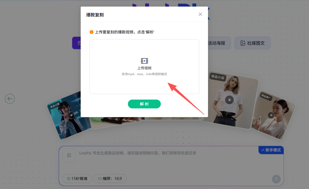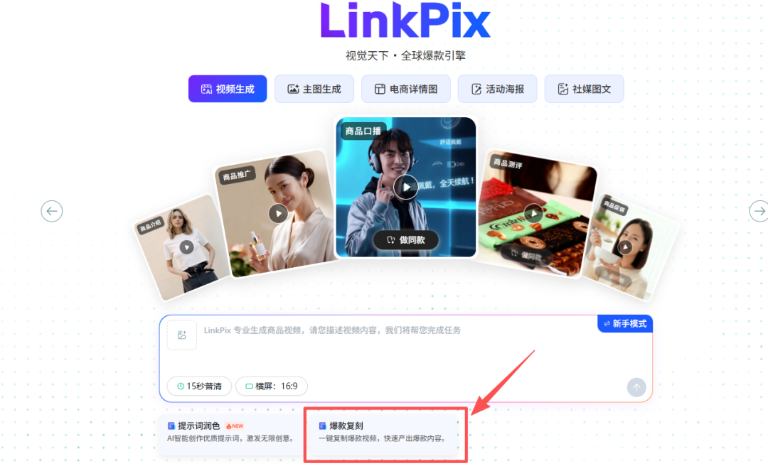 如果看到同行的爆款视频想借鉴风格,LinkPix的视频复刻功能就能帮上忙——核心不是直接搬运,而是通过爆款视频反推提示词,让你快速掌握优质风格,同时产出原创内容。