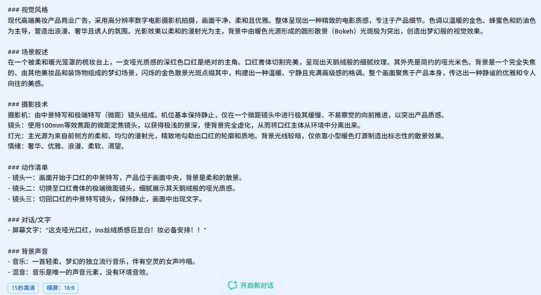 你只需把提示词中的产品替换成自己的(比如把爆款里的“XX口红”换成你的口红),点击生成,就能得到一条风格贴合爆款、主体为自家产品的原创视频,既借鉴了成功经验,又保证了原创性,爆款概率大大提升。