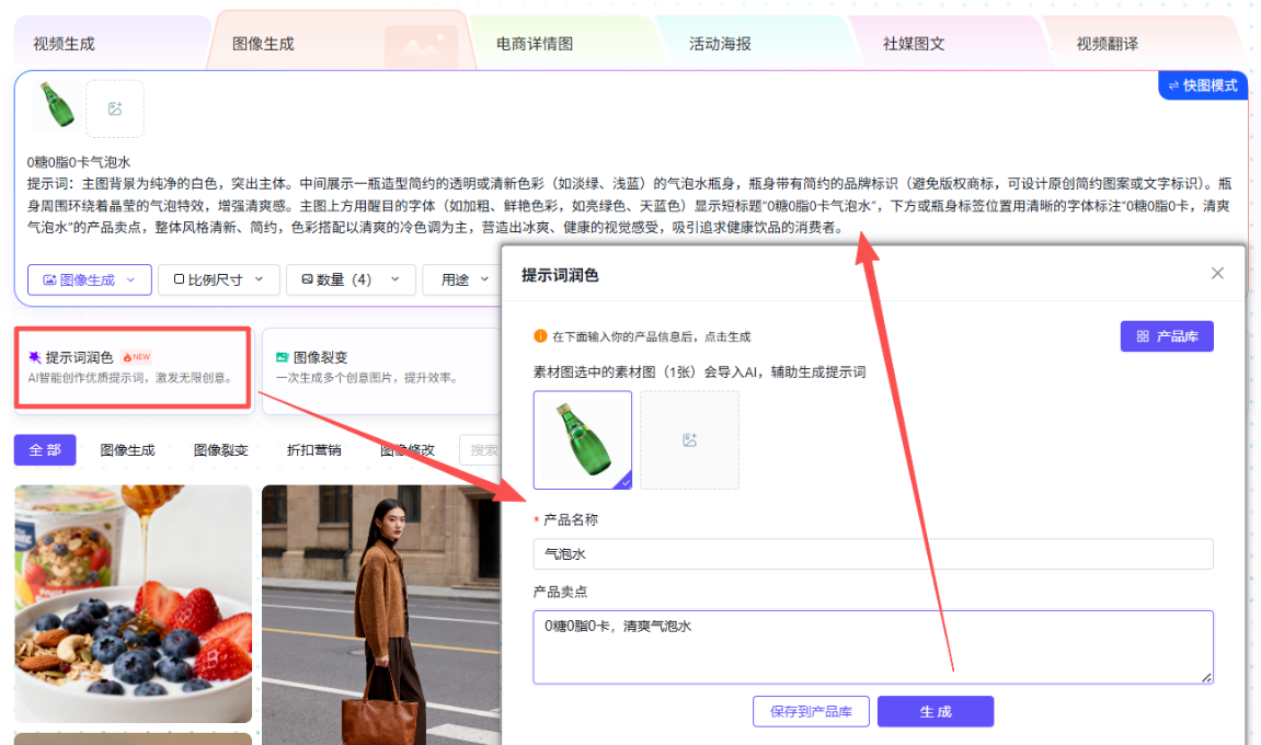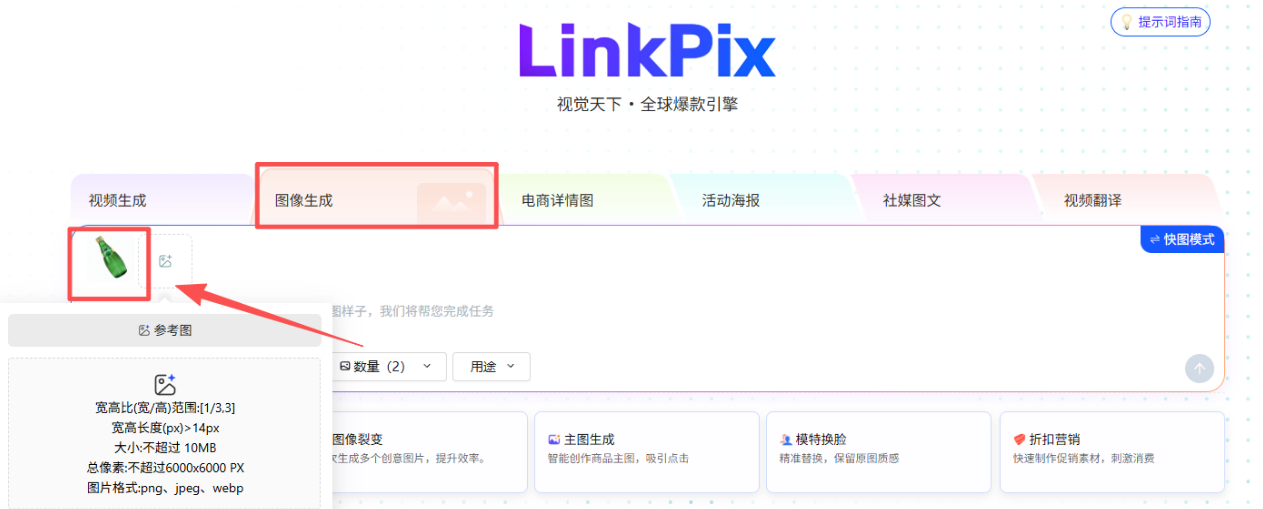 打开LinkPix,上传你的产品白底图、实拍图。不管是家居用品、服装配饰、食品饮料还是美妆护肤,只要清晰展示产品细节,AI就能精准捕捉产品特征,生成不跑偏的高质量图片~