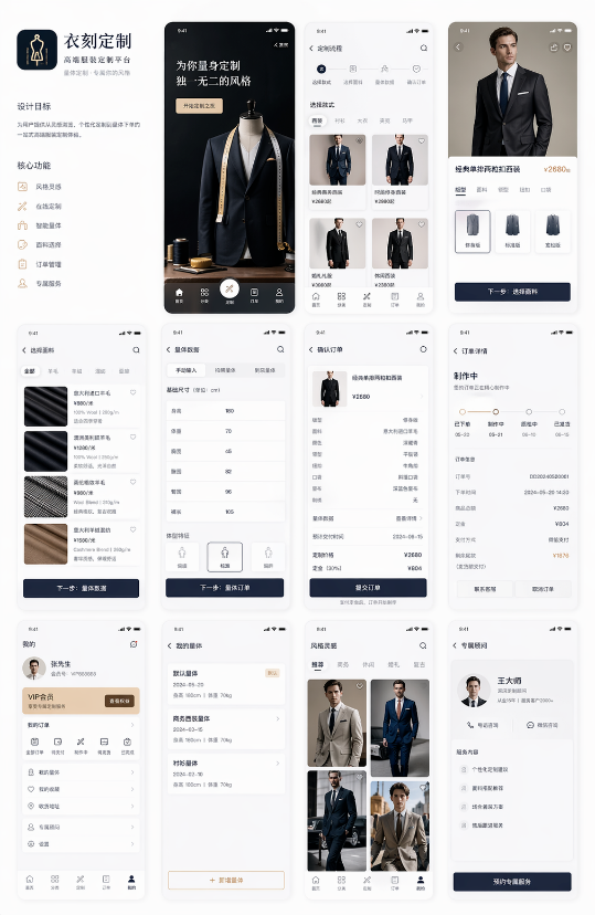 提示词:设计一套完整的服装定制App的产品UI图