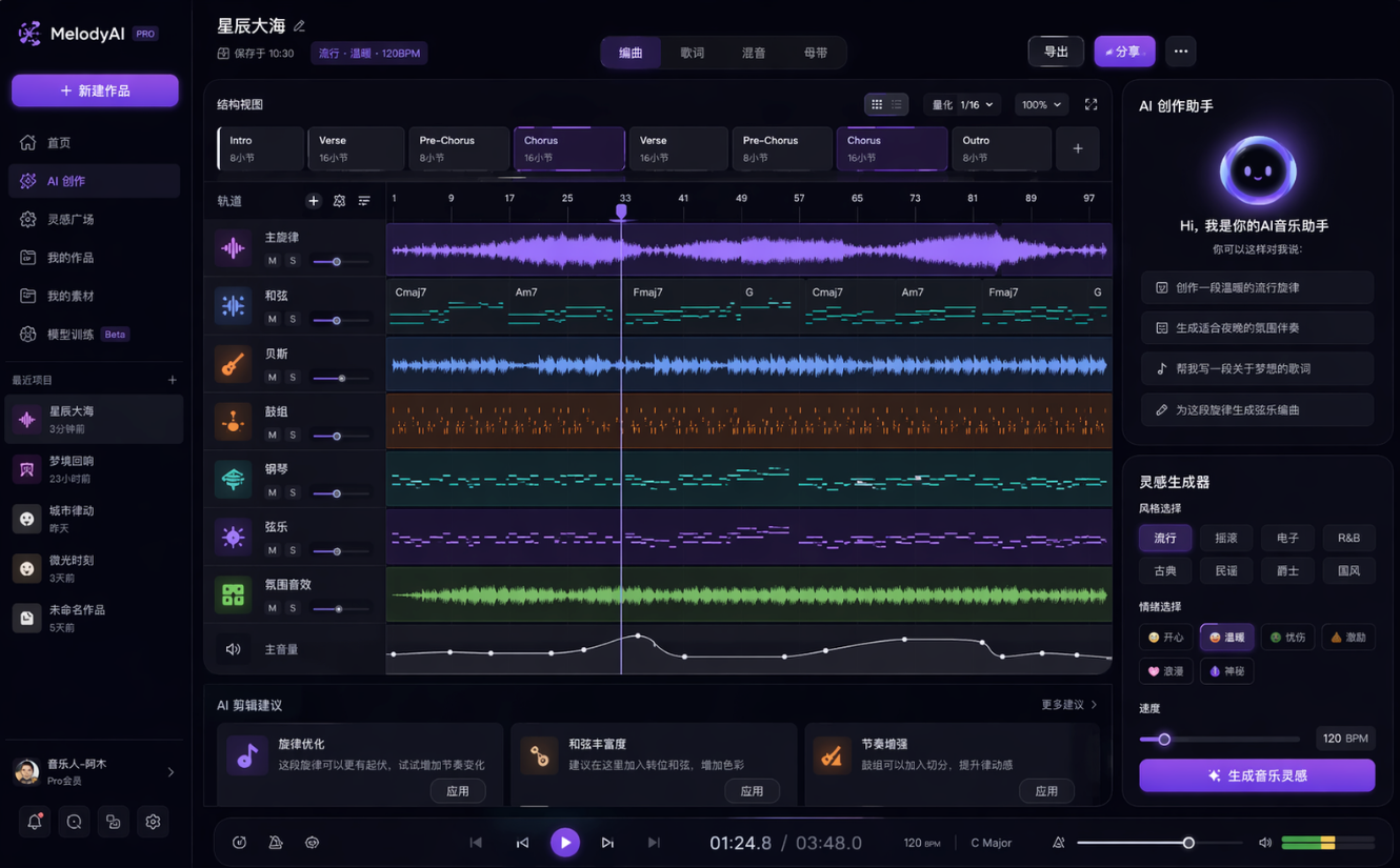 提示词:设计一套完整的AI音乐创作App的产品UI图